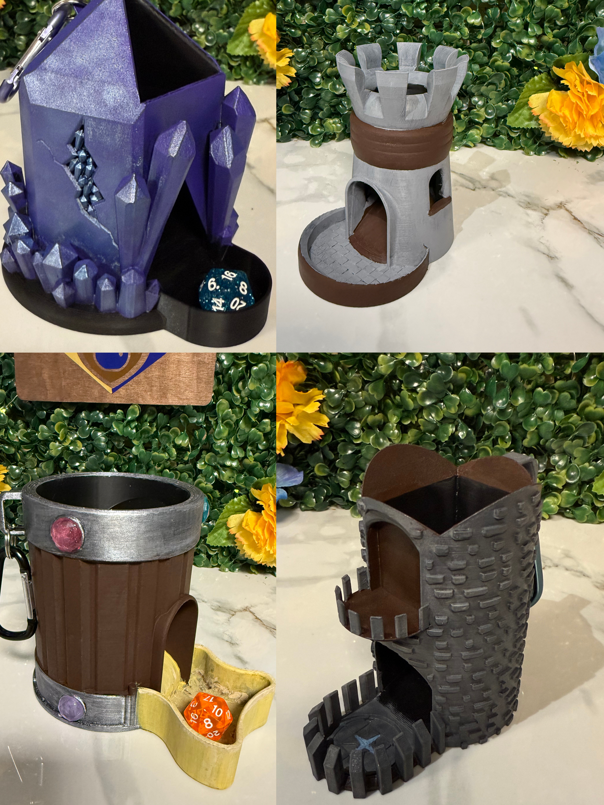 Each 3D Printed Dice tower is small enough to hang on a bag or your fantasy belt for a ren faire. Easy to travel and fun to roll, these little dice towers are the perfect addition to your D&D bag!