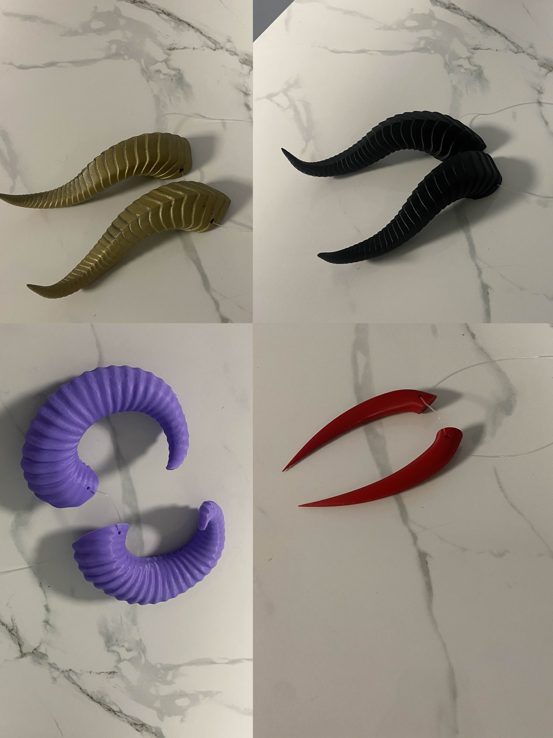 3d printed fantasy cosplay additions for your favorite outfit. attached with elastic cord, these horns are comfortable and easy to adjust to whatever position you want.