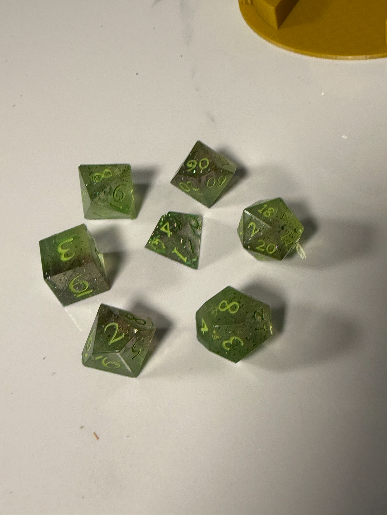 Hand Made Resin Dice - 7Pcs - Green & Black w/ Green Ink - Defects