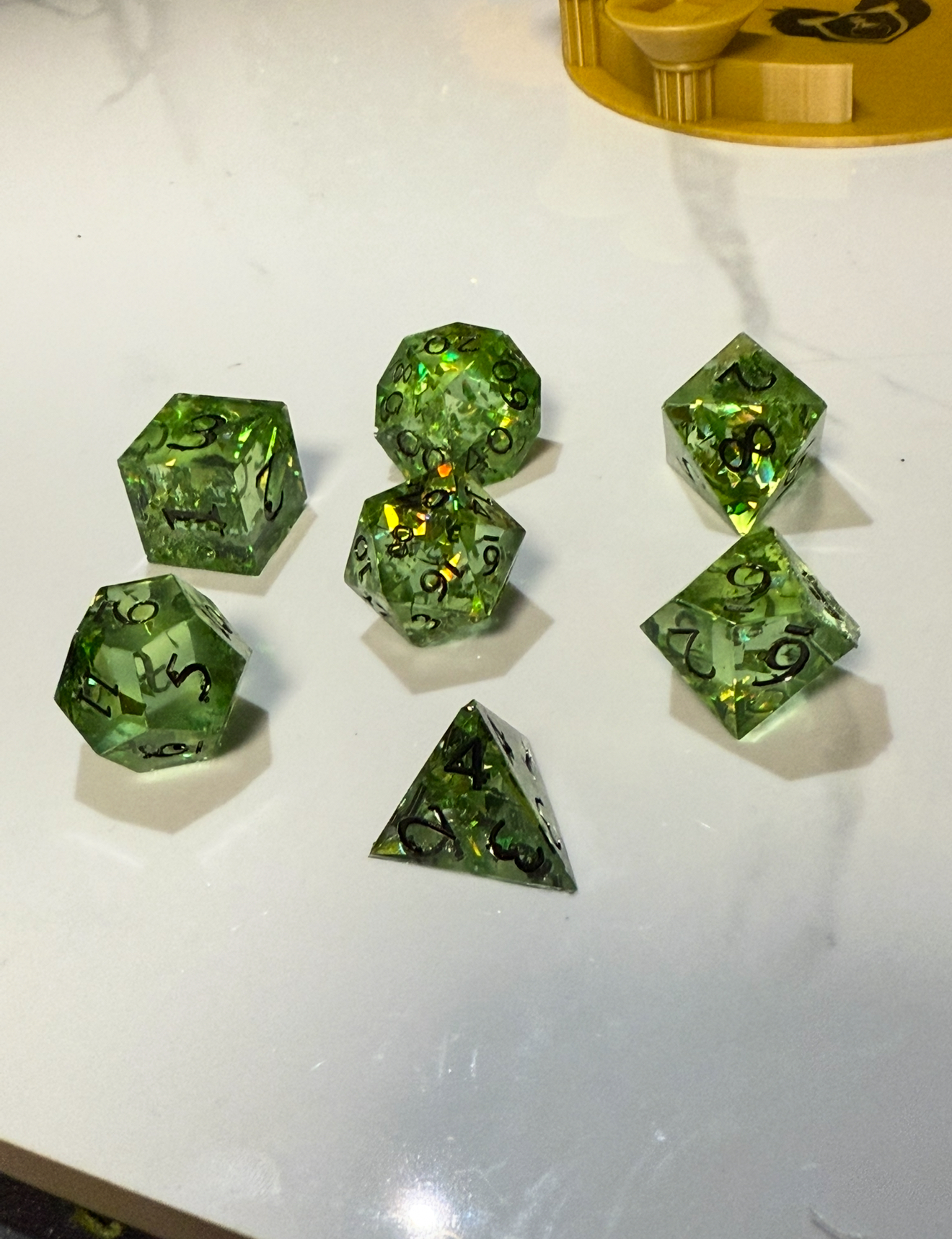 Hand Made Resin Dice - 7Pcs - Green w/ Black Ink - Defects